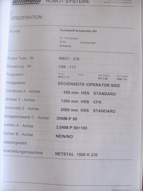 Wittmann W621 x=550 mm y vert. =1200mm Z=2000 mm +C year 2000Description: